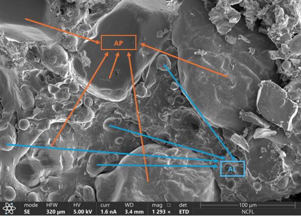 Figure 1. Scanning Electron Microscope micrographs of the fractured surface of AP-AL-CNT 2% PDMS composites embedded in a PDMS matrix, highlighting key microstructural features: aluminum (AL) particles (blue), and ammonium perchlorate (AP) crystals (orange). The distribution and morphology of each component indicate heterogeneous dispersion.